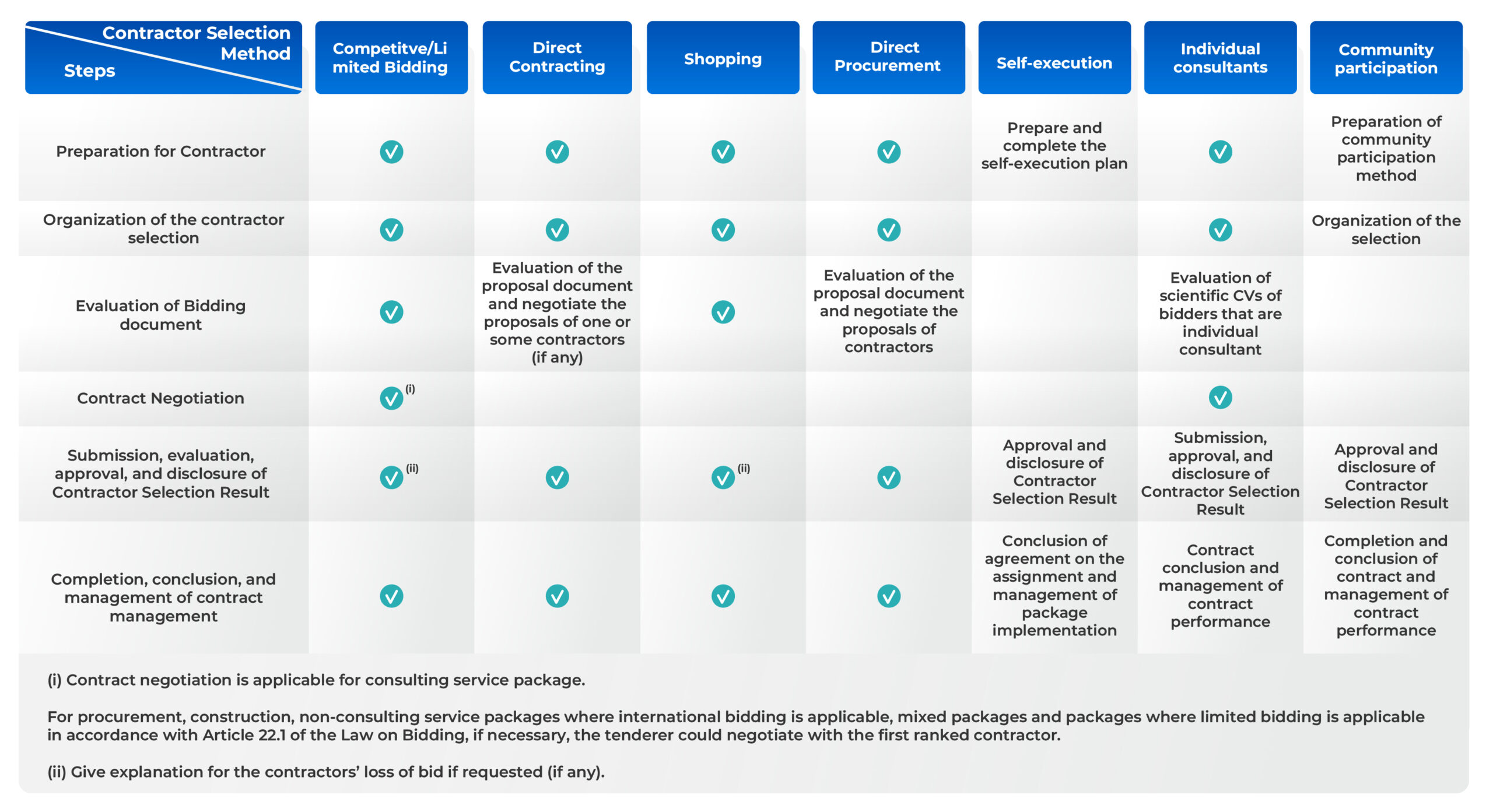 Contractor selection is one of the most important and decisive steps during the implementation of investment projects, especially projects in which state capital or preferential loans are utilized. Correct selection of contractor would not only ensure the quality and project implementation progress but also contribute to the capital usage efficiency and mitigation of legal and financial risks.