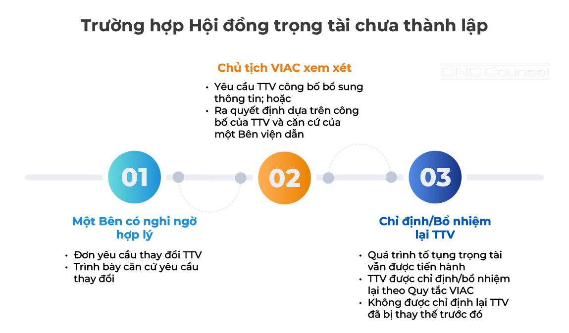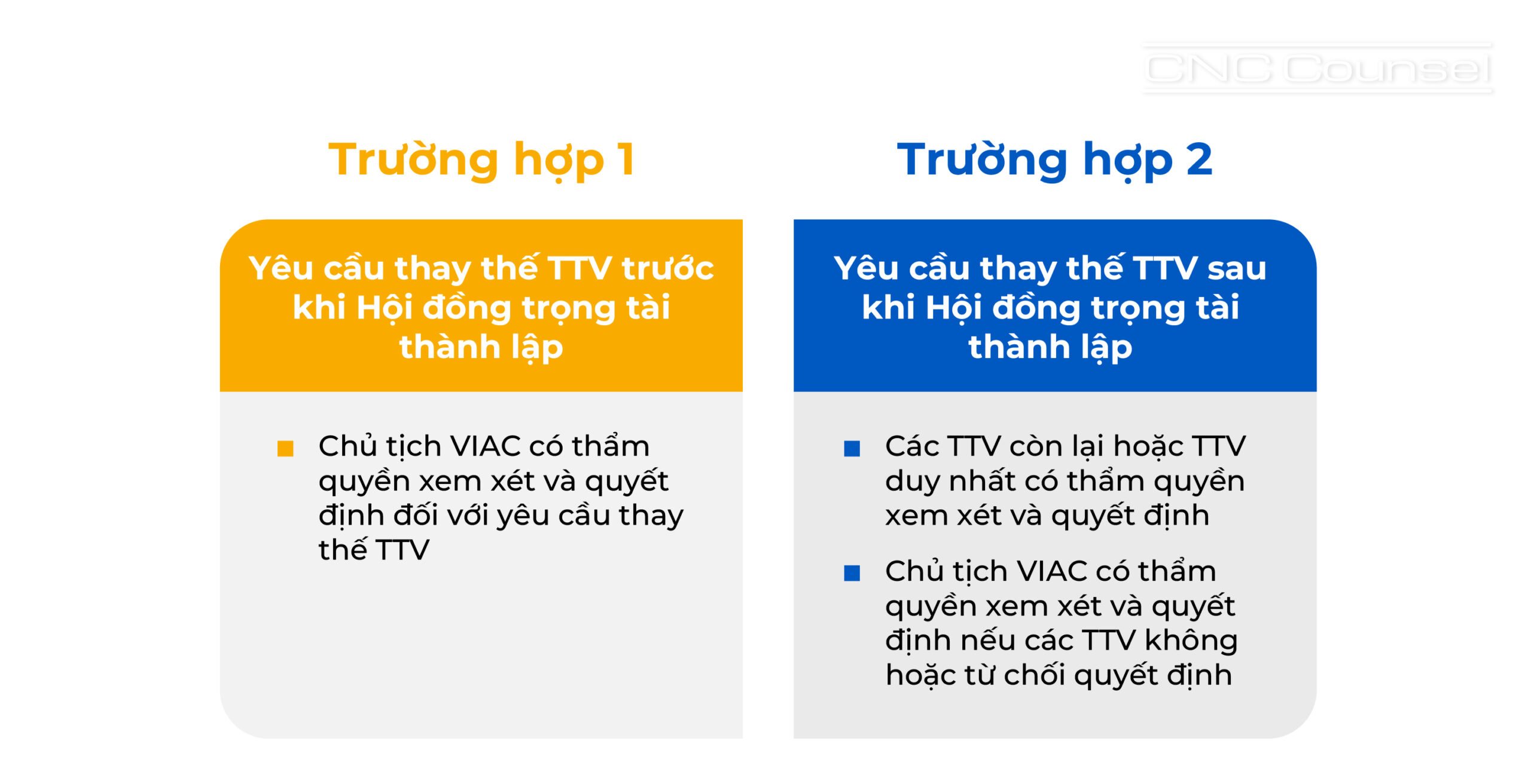 Áp dụng đối với trường hợp một Bên yêu cầu thay đổi Trọng tài viên khi Hội đồng trọng tài chưa thành lập (cho cả Hội đồng trọng tài gồm 3 Trọng tài viên và Hội đồng trọng tài gồm 1 Trọng tài viên duy nhất)