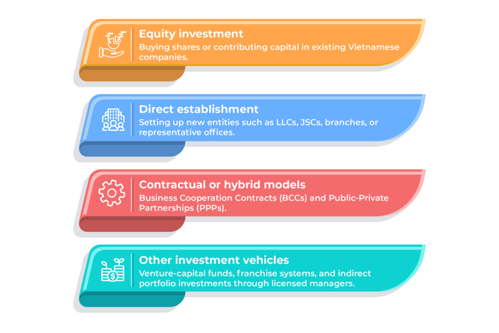 Vietnam’s legal framework allows a diverse range of business structures and investment channels, each designed for specific commercial purposes and levels of control. Foreign investors can participate through the following main forms: