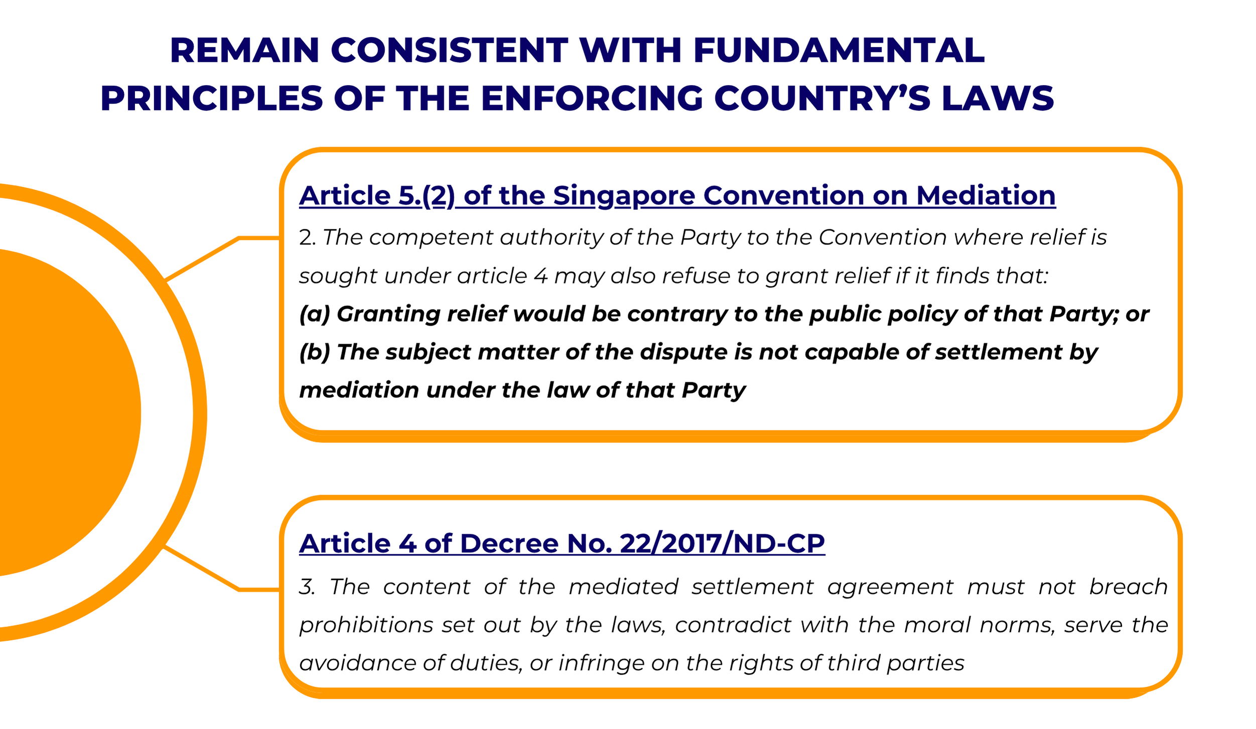 The content of the mediated settlement agreement is an important and foundational issue that parties must absolutely be mindful of for the recognition of the result. If the content of the agreement is prohibited per the enforcing country’s policy or breach the laws, the agreement shall not be recognized and enforced. Regarding the stipulation, the Singapore Mediation Agreement only provides general pretexts to reject requests. In contrast, Decree No.22/2017/ND-CP, in combination with Article 417 of Civil Procedure Code, specifies the requirements for requests to be accepted.