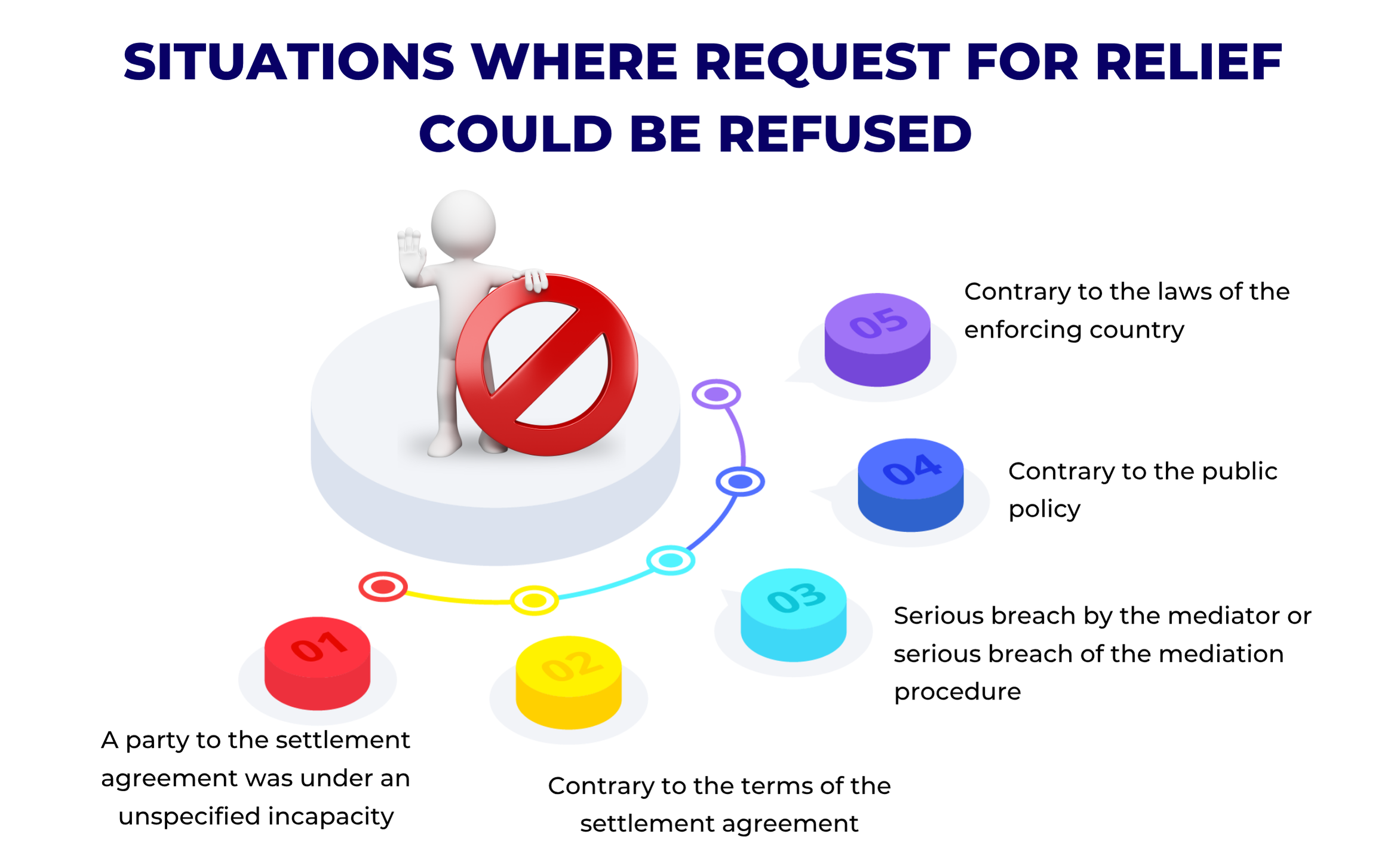 If the request for relief is refused, the competent authorities of the enforcing countries shall give one of the following reasons to refuse granting relief per Article 5 of Singapore Convention on Mediation, namely: