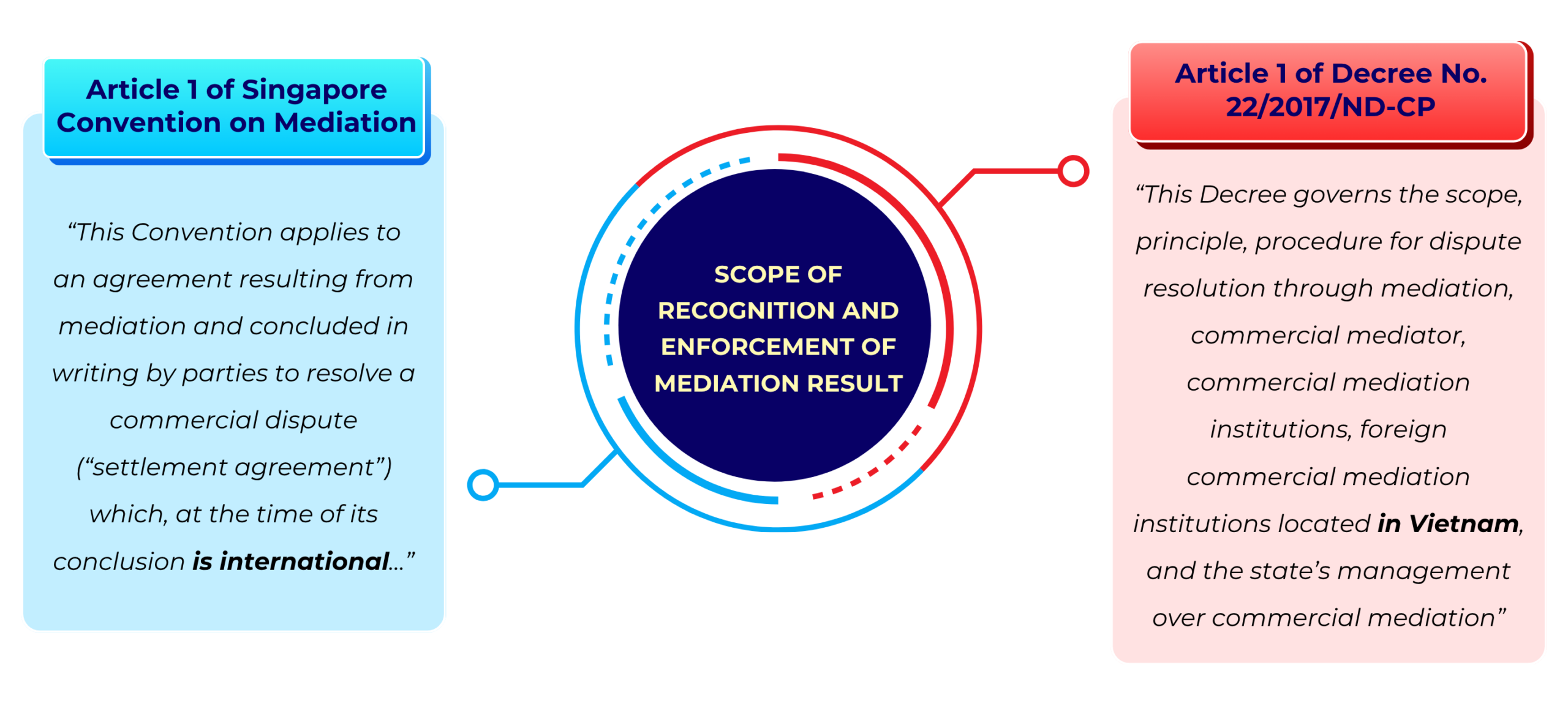 Regarding the scope, the scope of recognition and enforcement in relation to commercial disputes in the Singapore Convention on Mediation is broader, compared to Decree No. 22/2017/ND-CP.