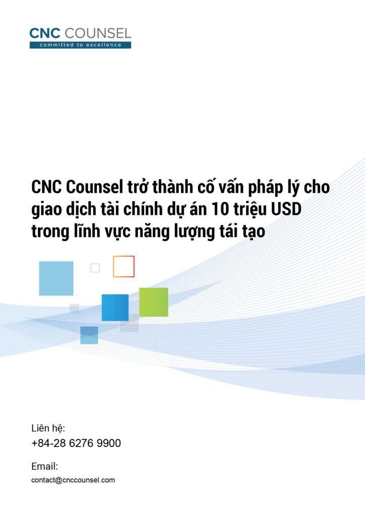 Sau thành công của Hợp đồng tín dụng phục vụ Giai đoạn 2 dự án điện mặt trời áp mái tại Khu công nghiệp Bàu Bàng, tỉnh Bình Dương (xem thêm tại đây) với chi nhánh ngân hàng nước ngoài, CNC Counsel tiếp tục được Quý Khách hàng tin tưởng chỉ định làm cố vấn pháp lý cho một giao dịch tài chính dự án trị giá 10 triệu USD trong lĩnh vực năng lượng tái tạo.