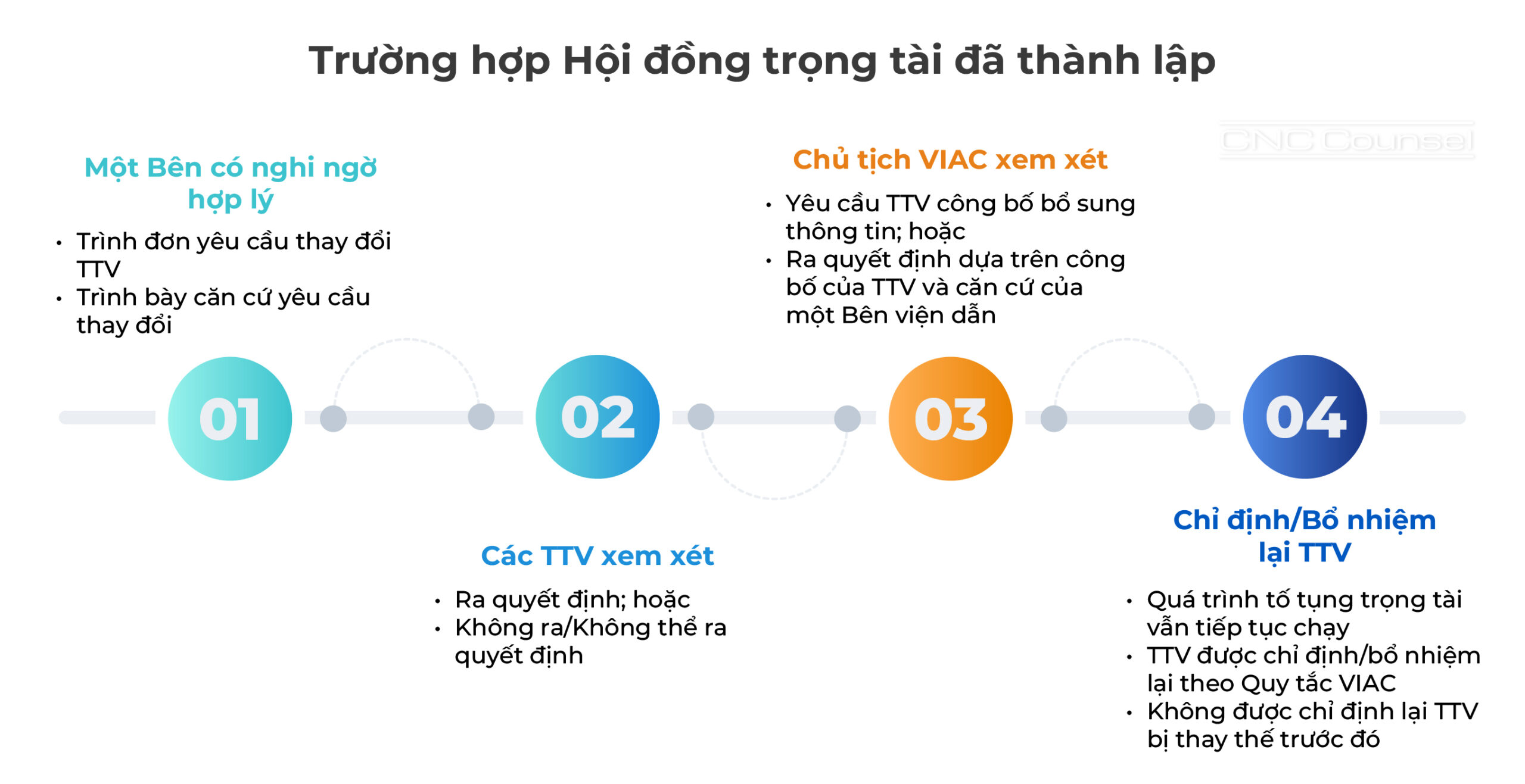 Áp dụng đối với trường hợp một Bên yêu cầu thay đổi Trọng tài viên khi Hội đồng trọng tài chưa thành lập (cho cả Hội đồng trọng tài gồm 3 Trọng tài viên và Hội đồng trọng tài gồm 1 Trọng tài viên duy nhất)